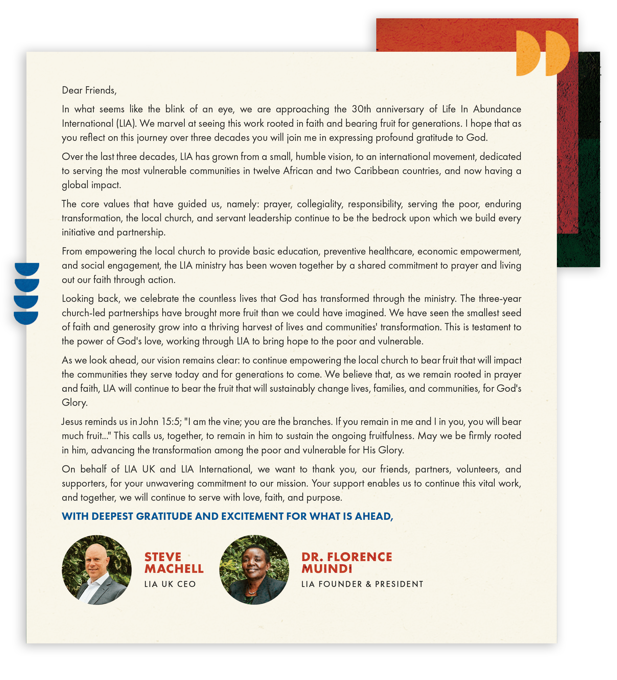 As we look beyond 2024, Life in Abundance (LIA) International remains committed to expanding its impact by empowering local churches and transforming vulnerable communities. The mid-term review of the 2022-2026 Strategic Plan highlights significant achievements, including deeper community engagement, strengthened financial performance, and growing global partnerships. Together with the Ministry Support Offices in the US and Europe, LIA-UK have played a crucial role in mobilising resources and expanding the reach of LIA International.